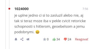Možno sa budete čudovať, ale ja naozaj netuším, čo je a nie je šírenie nenávisti. Dôkazom je aj to, že ma pred pár rokmi zablokovali za šírenie nenávisti (napríklad som mala výhrady voči manželstvu jedného známeho muža so 6 ročným dievčatkom menom Ajša, keď on mal vyše 50, čo bolo vyhodnotené ako rasizmus a xenofóbia). Rozhodla som sa však polepšiť a inšpirovať od slušných ľudí. Zamerala som sa na príspevky vážených komentátorov a ľudí, ktorí dostali ocenenia za svoju publikačnú prácu. Tí určite nenávisť nešíria. Zároveň som zamierila do diskusií jedného z najslušnejších denníkov, aby som sa podľa zmazaných/nezmazaných príspevkov od administrátorov diskusií intuitívne naučila, čo to je a čo nie je nenávisť.