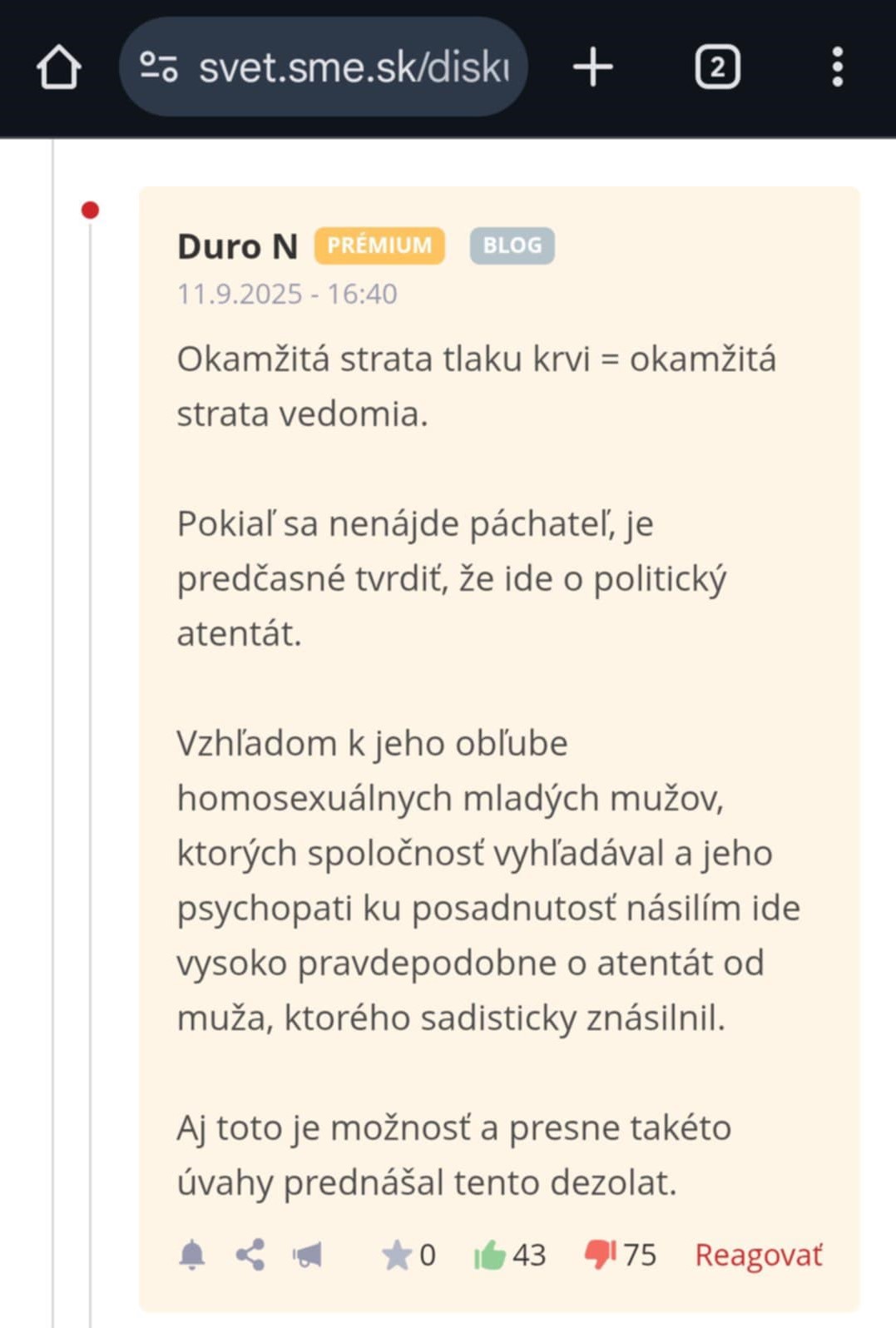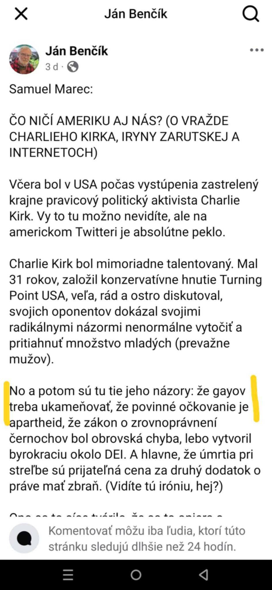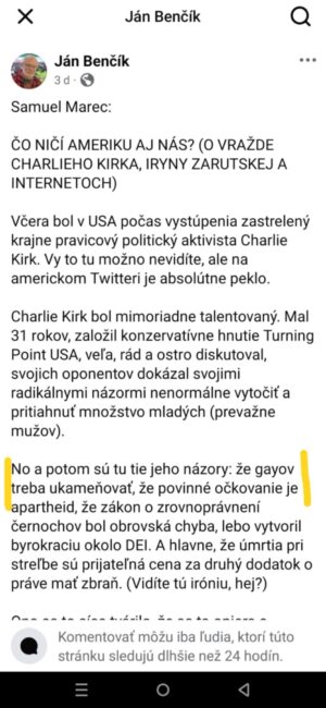 Ale možnože administrátorom diskusií krivdím, možno len nemali čas nazrieť do diskusií a zablokovať nenávistné príspevky. Ups, nakoniec predsa len niečo zmazali. Príspevok, ktorý hovoril o tom, že Charlie Kirk bol správny chlap a mnohé jeho názory boli v súlade so zdravým rozumom. Bol to pomerne dlhý príspevok, kde vymenoval niektoré jeho názory, že napríklad podľa štatistík sú najšťastnejšie tie ženy, ktoré sú vydaté a majú deti. Ja som si naivne myslela, že to bol slušný príspevok. Mýlila som sa, bol zmazaný ako nenávistný.